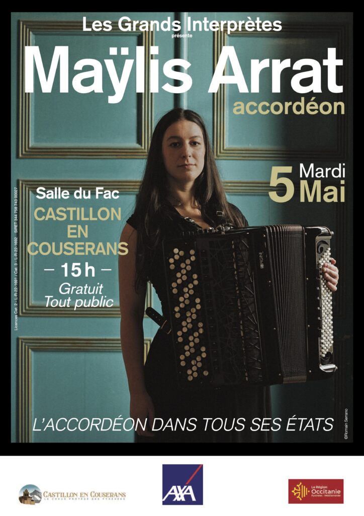 Originaire de la région toulousaine, Maÿlis Arrat commence l’accordéon dès son plus jeune âge avant d’intégrer la classe de Grégory Daltin au Conservatoire de Toulouse à 15 ans. Elle complète sa formation aux conservatoires de Toulouse et de Gennevilliers, où elle obtient son Diplôme d’Études Musicales avec les félicitations du jury en 2022. Son parcours est marqué par plusieurs distinctions internationales, notamment le Premier Prix du 47ème concours de Castelfidardo (PIF) en Italie en 2022. Plus récemment, elle remporte en 2024 le Premier Prix à l’unanimité de l’Open Master du Cap Ferret Music Festival, puis, en 2025, le Premier Prix, le Prix d’Honneur et le Prix du Public lors de la 99ème édition du Concours International Léopold Bellan.